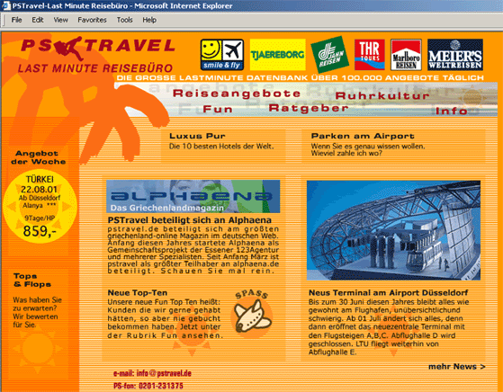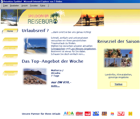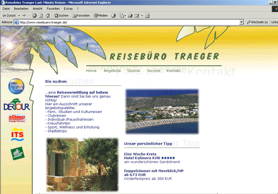 Datenbanken im Internet machen natürlich nur Sinn, wenn Ihr Reisebüro einen eigenen Online-Auftritt besitzt. Sollten Sie noch nicht im Internet vertreten sein, so kümmern wir uns gerne um alle anfallenden Aufgaben. Wir reservieren für Sie den Domainnamen, programmieren und gestalten die Homepage, richten ihre e-mail ein und machen Sie mit den nötigen Grundkenntnissen vertraut.
